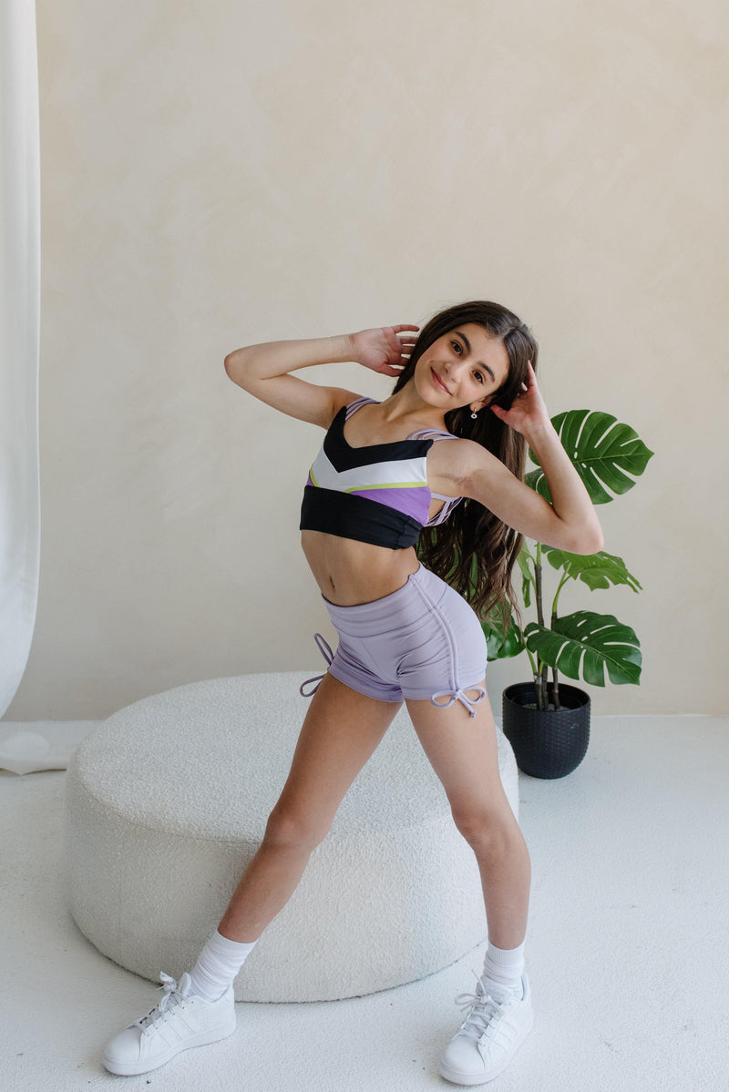 Meet the BRIAR sports bra, designed specifically for our YOUTH dancers! The perfect everyday sports bra to train day and night in. Designed for maximum comfort, practice your tricks and flips and feel supported and confident. Our webbed back, multi strap design,  can be spotted from across the room. Stand out with our colour block inserts and mix and match different bottoms for multiple looks. Runs true to size.
